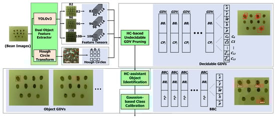 Figure 5 shows the architecture of the DIDN, which is an improvement version of our previously designed deep network [36]. The DIDN consists of four main components and each of them are described below. The first component is the dual object feature extractor, used to extract object features from image inputs. For generality of system design, the term “object” is used for representing coffee beans in this paper. This module adopts two methods as underlying feature extraction engines: one is YOLOv3, which is a deep network structure for object feature predictions; the other is Hough circle (HC) transform, which is to extract circular shapes from a given image. Details of the two methods will be presented later. The second component is the HC-based undecidable bounding box pruning module, which is used to pruning those undecidable bounding boxes by using HC information. An undecidable bounding box means more than two or no objects appear stay inside a bounding box, which is generated by the DL model. For many DL-based object detection methods, such situations frequently happen in the intermediate data, and usually the application interface suppresses most these data and uses the case of highest probability for result interpretations. In our scheme, only undecidable bounding boxes are pruning and all decidable bounding boxes are reserved, since they provide information of object confidence and class probabilities for calibrating other overlapped bounding boxes.