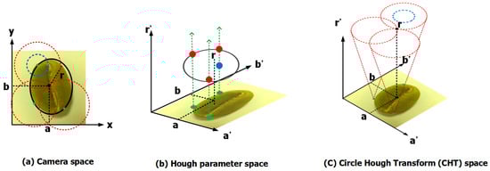 The HC transform is a feature extraction technique for detecting circles/eclipses from imperfect digital image inputs [38,39]. Figure 6 shows the idea of the HC transform. In a two-dimensional space, a circle is expressed as follows: