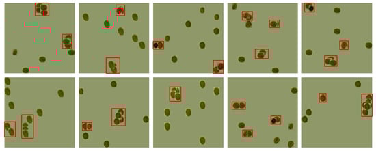 Figure 13a–d shows the augmented bean images of different densities for being used in the training stage. Figure 13a is the original image labeled by a human, and Figure 13b–d are generated with different densities by our proposed LBIG module presented in Section 4.5. The generated images contain different densities, which are categorized into low, medium, and high-density coffee beans, respectively, in our work. We visualize some of them in the figure for illustrating what is happened in the stage of executing the LBIG module. From the figure, it is clearly that our scheme indeed generate the very different augmented bean images to be used in the training stage for increasing defect inspection capacity of the DIDN model. We design experiments presented later to study whether these generated images assist the DIDN to train models of superior identification performance.