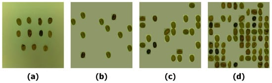 Augmented bean images: (a) original, (b) low density, (c) medium density, (d) high-density.