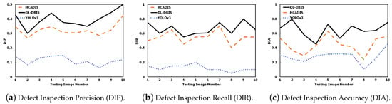 The DIP values stand for the ratio that classifying normal beans into defects, and the higher DIP values signify that a defect inspection scheme makes less mistakes. From the experimental results shown in Figure 15a, DL-DBIS has higher DIP values than HCADIS and YOLOv3, meaning that our proposed scheme is the best among the three. HCANDIS uses the HC transform to calibrate the prediction results from YOLOv3. Since most beans are of the circular shape, HCANDIS can successfully calibrate many mistakes of YOLOv3 and thus performs better than YOLOv3. Our proposed DL-DBIS can automatically generate new bean images in the training stage through the LBIG module and further prune the unnecessary bounding boxes by using HC transformation. Since low quality images are pruned by the model quality control in DL-DBIS, those augmented bean images can effectively increase the precision of the bean inspection model. Therefore, the DL-DBIS performs superior than HCADIS and YOLOv3.