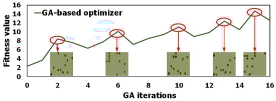 The fitness value as a function of the GA iterations.