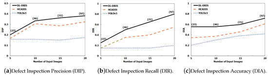 Figure 17 shows the performance comparisons of various defect inspection schemes to different number of human-labeled images. The horizontal axis is the number of inputted images, which varies from 5 to 20 human-labeled bean images, and the vertical axes are the DIP, DIR, and DIA defined above in subfigures, respectively. Due to the data augmented method GALDAM used in the proposed DL-DBIS, the numbers of generated bean images used in the training are also placed in the parentheses, i.e., in each case, respectively, for further reference. Recall that there is model quality control in DL-DBIS, and these automatically generated images have properties of low degree of bean overlapping and low detection rate. This is the reason why these numbers are not rounded integers.