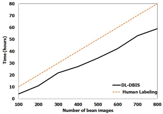 Comparison of labeling time between the proposed deep-learning-based defective bean inspection scheme (DL-DBIS) and human labeling.