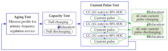 The parameters of the tested LiFePO4/C battery are listed in Table 1. Figure 1 shows the process of the whole tests. The battery was aged using a primary frequency regulation mission profile for a period of 38 weeks. After each week of aging, the capacity of the battery was measured. A set of current pulse tests under different TCs were performed to generate the voltage datasets. The detailed process of the experiment is presented in the following subsection. During the battery aging test and the performance check-up, the battery was placed in a climatic chamber with a temperature set point of 25 °C [25] and the sample period of one second was adopted.