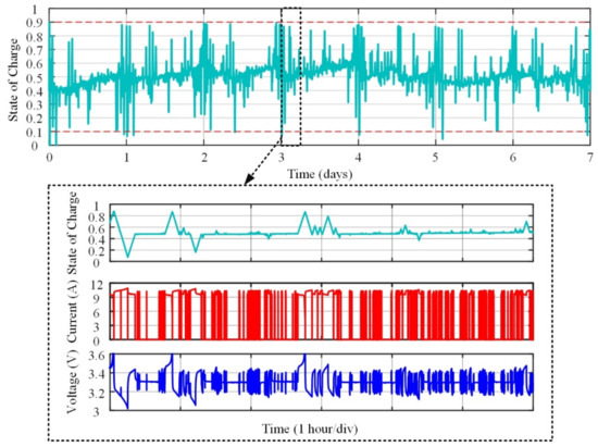 State of charge variation in the aging mission profile and the current and voltage response in the zoomed part.