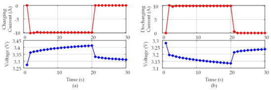 Pulse current and voltage response in the current pulse test. (a) Charging; (b) Discharging.