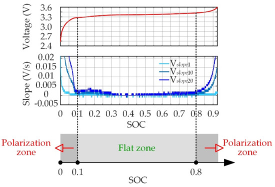 here Vslope1, Vslope10, and Vslope20 is the slope for the 1 s, 10 s, and 20 s intervals, respectively. The trend of the slope curve shows that the polarization of the battery cell is serious at the depleted state (polarization zone) and the variation of battery voltage in mid-SOC range is flat (flat zone) [33]. This is why the voltage datasets under TC2, TC5, and TC6 varied more rapidly than that under other TCs.