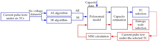 The overview of the proposed analyzing method is illustrated in Figure 9. The AE and SE were computed using the voltage datasets and the first-order polynomial fitting was chosen to explore the entropy-capacity mapping [23]. By comparing the accuracy of both estimators, the best suitable TC can be selected. In order to select the best suitable scale, three MSE-based estimators (scale 1, 2, 3) were constructed based on the selected TC.