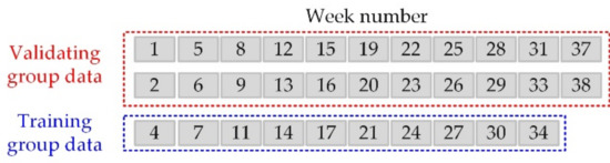The datasets were divided into the validating group data and training group data, as shown in Figure 10, and the training group data were used to establish the relationship between the battery capacity and entropy. The accuracy of the estimators was verified by the validating group data. Based on the optimal selection strategy of the minimization of the maximum sample entropy relative error, the parameters of m, r, N of the entropy algorithm were taken as 3, 0.04, and 30, respectively. The accuracy of the capacity estimators was evaluated using the mean percentage error (MPE) and the root-mean-squared percentage error (RMSPE), and their expressions are