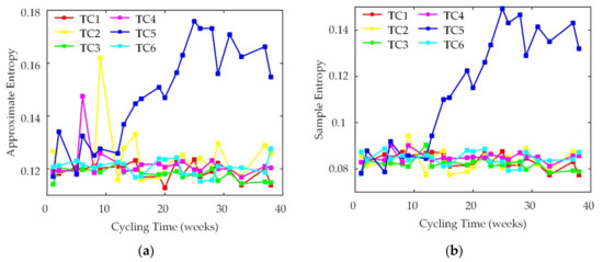 Curve of the calculated entropy during the cycling of the tested battery cell. (a) Approximate entropy-based method; (b) Sample entropy-based method.