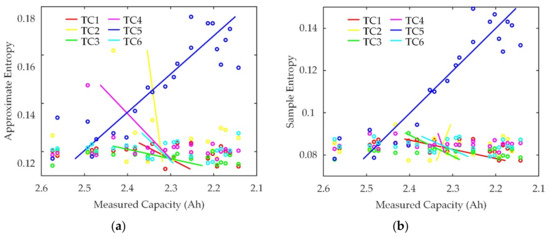 It can be seen from Figure 11 that the AE feature and SE feature under TC5 changed more obviously than that under other TCs. As the value of SOC under TC5 will enter the polarization zone in the future, quick changes of the voltage response at high SOC level will lead to large differences in entropy. In contrast, the SOC will become smaller for TC6 and it is away from the depleted state. Hence, TC6 cannot be used to estimate the capacity, and the results agreed with the previous analysis of polarization characteristics in Section 4.1. The relationships between the AE/SE feature and the capacity were acquired based on the first-order polynomial fitting. As shown in Figure 12, the variation of entropy over the capacity was flat under other TCs (except TC5), which will lead to a large estimation error.