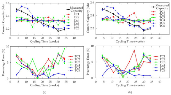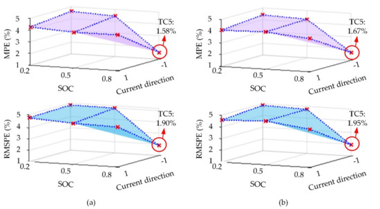 Consequently, as shown in Figure 13, the percentage error under TC5 was lower than that under other TCs in most ranges of the cycling time. The three-dimensional diagram of MPE and RMSPE with respect to two impact factors is shown in Figure 14. When the SOC was 0.2 and 0.5, the estimation errors were relatively high regardless of what the current direction was because the battery state was in the flat zone. The best accuracy for the AE-based and SE-based estimators was achieved under TC5 as a result of polarization. Similarly, a low SOC level (i.e., smaller than 0.1) can also lead to high accuracy as a result of the polarization; however, this case was not considered in the experiment. In addition, both AE-based and SE-based methods showed very similar estimation errors. Based on these results, it can be concluded that the combined action of the SOC level and the current direction has the main effect on the capacity estimation accuracy. Only if the battery state enters into the polarization zone will high accuracy be achieved.