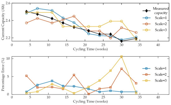 As the SE-based method in TC5 showed the best performance in terms of MPE and RMSPE, the MSE-based method was selected as a case study to analyze the effect of scale on the capacity estimation accuracy. The voltage dataset measured from TC5 was used for the MSE feature calculation, and the scale had the value of 1, 2, and 3, respectively. It can be seen from Figure 15a that no linear relationships between the MSE and the cycling time existed when the scale was larger than one. As a result, as seen in Figure 15b, the slope of the first-order polynomial function was negative, which will lead to a large estimation error. The estimation results in Figure 16 indicate that the percentage error of the MSE-based method decreased with the reduction in the scale. Table 3 shows more clearly that the MSE-based method with scale 1 had the highest accuracy. In this case, MPE and RMSPE were 1.67% and 1.95%, respectively. It can be concluded that MSE feature is not suitable for battery capacity estimation, because enlarging the scale factor means a reduction in sample points and eventually causes a drop in estimated accuracy.