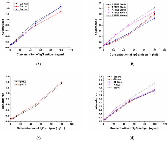 Changes in calibration linearity against different concentrations of IgG. Under conditions of (a) APTES incubation times of 30 ~ 150 min, (b) the amount of Glutaraldehyde, (c) pH of 6.2 and 7.2, and (d) different storage days from one to 28 days.