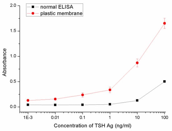 In this study, we could detect TSH antigen as low as 0.026 ng/mL using the normal ELISA. However, when we use our developed ELISA method using the plastic membrane, the observed detection limit was measured to be 0.001 ng/mL. This sensitivity is comparable to other relatively high technology and luminescence based detection methods [].