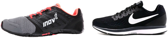 Shoes used in the experiment. Minimalist shoe: INOV-8 Bare-XF 210 V2 (left). Cushioned shoe: Nike Air Zoom Pegasus 34 (right).