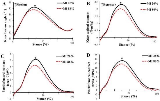 Comparison of the mean values of knee kinematics and kinetics from all participants between shoe conditions (MI 26%: cushioned shoes; MI 86%: minimalist shoes). (A) knee flexion angle during stance phase; (B) knee sagittal moment during stance phase; (C) patellofemoral contact force during stance phase; (D) patellofemoral contact stress during stance phase. *P < 0.05.