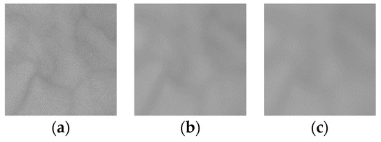 Palm vein image from 850 nm with different TPAVs after filtering. (a) TPAV = 20.2188 from the original ROI; (b) TPAV = 8.7939 with δ = 1.8; (c) TPAV = 1.7296 with δ = 2.6.