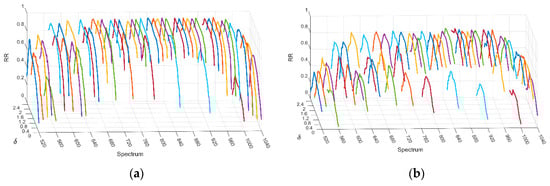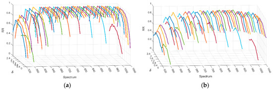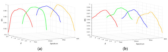 Recognition rates (RR) with different acutance (corresponding to δ) for every band (spectrum) of HDHV using different local texture patterns. Results using the feature extraction methods of (a) regional local binary patterns (LBP); (b) deep features.