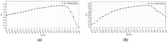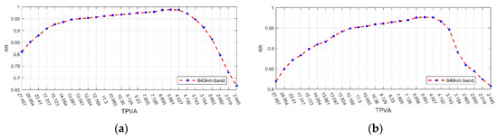 For the HPV database, RR had the same tendency as the above (HDHV), which confirmed the hypothesis that an optimal range based on image acutance does exist (see Figure 11). With different feature descriptors, the optimal acutance range of a single band (840 nm for example in Figure 12) is 4.927–6.856, using CompCode where the highest RR can reach 0.9880 (see Figure 12a), which is an improvement of 21.8% compared with the original image (RR = 0.8110).