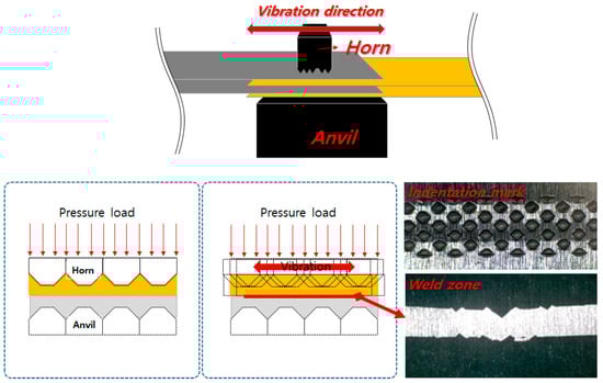 Ultrasonic welding is one of the representative welding technologies using plastic flow, with low electrical resistance as the oxide film and impurities are removed and welded through the diffusion of metal by vibration [1,2,3]. Ultrasonic welding also makes it possible to weld nonferrous metals or dissimilar metals that are difficult to bond using conventional methods, and it is mainly used for thin foils, because its effect on metal is relatively small compared to other welding methods due to the very short welding time. Research has found that ultrasonic metal welding is an excellent precision welding method, as it is very much superior in terms of process time and contact resistance [4].