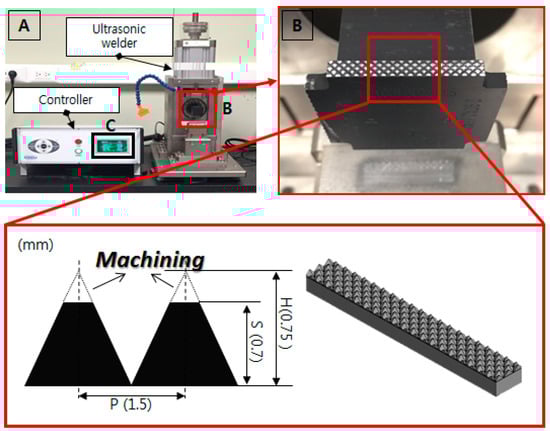 Ultrasonic welding, as shown in Figure 1, is a process in which high-frequency vibrations of 20 kHz or higher are partially applied to the welding material to form a joint. When ultrasonic waves are used for welding metallic materials, they are applied in the lateral direction parallel to the material’s surface, and when they are used for welding plastic materials, they are mainly applied in the longitudinal direction perpendicular to the material’s surface [1,2]. The ultrasonic metal welding system consists of a power supply, converter, booster, and horn, and by converting the electrical energy of 50–60 Hz coming from the power supply into mechanical vibration energy of 20–40 kHz through the converter, when the booster amplifies the micro-vibrations to be used in metal welding, the oxide film and the contaminated film on the metal surface are destroyed by the frictional heat generated by the vibration on the deposited metal through the horn, thus forming a metallic bond [22,23].