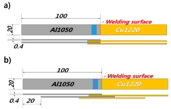 In this study, 20 mm × 100 mm × 0.4 t specimens, as shown in Figure 3, were used for lap joint welding; these specimens were also used to evaluate the strength of weld after the experiment was completed. The experiment was performed in two groups with a total of 25 welding conditions. The base materials used in the experiment were aluminum 1050 series and copper 1220 series. A total of four layers were formed for multi-layer dissimilar metal welding, and the aluminum and copper were arranged to cross each other. There are two types of specimens produced through the experiment. As shown in Figure 3a, the experiment with four specimens stacked up in a uniform arrangement was designed to simultaneously tension the four specimens, and in Figure 3b, the specimen was prepared to measure the shear strength by level in order to obtain the strength of each weld individually. A total of (25 × 2 = 50) experiments were conducted twice using 25 experimental conditions. The surfaces to be welded were cleaned in the order of stainless wire-brush, then sand paper—#400, #800, and #1500, to prevent foreign substances such as rust, scale, and oxides from causing weld defects.
