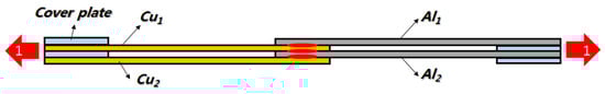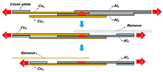 The specific value examined in this study is the shear strength. Two types of specimens were used to measure the shear strength, and the data obtained from each specimen are as follows. (1) Maximum tensile strength measurement using a test method that tensions the entire multi-layer welding specimen. (2) Shear strength measurement of three welds by tensioning each weld zone. A 10 ton UTM (Universal Testing Machine) was used to measure the shear strength, and to measure the maximum tensile strength, cover plates were inserted between the base materials, as shown in Figure 4, so that the load was transferred horizontally to measure the precise shear strength. Figure 5 shows the experimental procedure for measuring the multi-step shear strength of the weld. To measure the shear strength of each weld, the experiments were conducted in a sequence: Al–Cu tensile test, Cu–Al tensile test, and Al–Cu tensile test. Since there are no standards for measuring the shear strength of ultrasonic welds, a comparison of the welding conditions was performed by forming welds of the same area and measuring the quantitative shear strength.