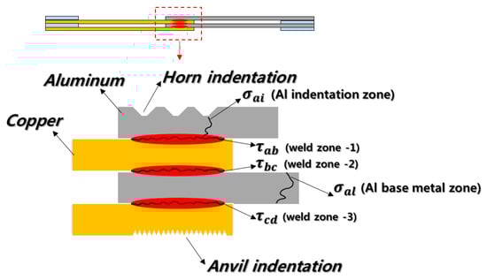 Ultrasonic multi-layer welding has three welds, and even if they are simultaneously tensioned to measure shear strength, they cannot be fractured at same time. The difference in strength between each weld and the material causes sequential fracture and the fracture location of the weld in the form of stress is shown as Figure 6. Because stress is related to the weldability, the better the weldability and the greater the force to withstand external forces that can be guaranteed by higher stress. Four fracture sequences were inferred through this experiment, and the fracture sequence, as shown in Table 3, could be predicted by the differences of stress at the fracture points. In Figure 6, is tensile stress of indentation at the aluminum upper sheet and σ_al is shear stress in the aluminum base material. The shear stresses of weld zones from 1 to 3 are , , and .