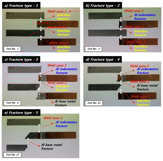 Five kinds of fracture types in a one-step shear strength test. (a) Interface fracture at all weld zones, (b) Combination fracture of Al indentation and interface, (c,d) Combination fracture of Al indentation, interface and Al base metal, (e) Combination fracture of Al indentation and Al base metal.