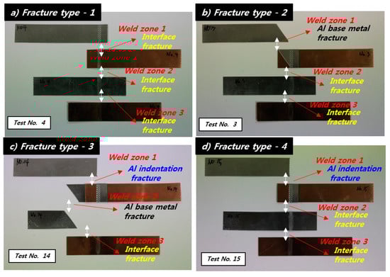 When the multi-layer ultrasonic welds are simultaneously tensioned, the fracture type can occur in five different shapes, as shown in Figure 8. Figure 8a is a case in which interface fracturing occurred in all of the welds. In case b, the break occurs at the end of the indentation, and then the interface fracture occurs in all of the welds. In case c, an indentation fracture occurs in weld zone 1 and an interface fracture occurs in weld zone 2. In addition, a fracture occurs in the aluminum base metal between the copper plates. In such a case, the shear strength is similar to the tensile strength of the aluminum base material. In case d, the primary fracture occurs in the indentation of the upper aluminum, and both interface and aluminum fractures coexist. In cases c and d, fracture types of aluminum—indentation fracture, interface fracture, and aluminum base material fracture—exist in the same way, but the location of the interface fracture is different. In case e, only two fracture types are shown. In this case, the second aluminum sheet is fractured in a state where the aluminum indentation fracture type of weld zone 1, and weld zone 2 and 3 are bonded together. However, when the welds were tensioned separately, a total of four types of fracture were observed, similar to the case of simultaneous tensioning. In Figure 9a, interface fractures occurred in all welds, and in case b, the aluminum base material fracture occurred in Al1–Cu1. Subsequently, interface fractures occurred in all of the other welds. In case c, aluminum indentation fracture occurred in Al1–Cu1, and aluminum base material fracture occurred in the Cu1–Al2 weld. In case d, aluminum fracture occurred because of indentation in the Al1–Cu1 weld, and interface fracture occurred in weld zones 2 and 3. Observing the welds separately, aluminum base material fractures, aluminum indentation fractures, and interface fractures were all observed in weld zone 1, and aluminum base material fractures and interface fractures occurred in weld zone 2. For weld zone 3, no type of fracture other than interface fracturing was observed.