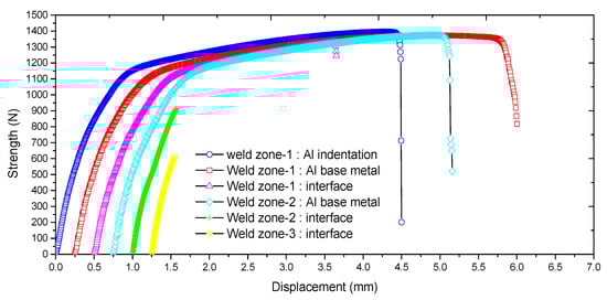 The individual displacement–strength curves of the welds are shown in Figure 11. As mentioned above, weld zone 1 shows three fracture types and weld zone 2 shows two fracture types. Weld zone 3 shows the interface fracture type, and Figure 11 shows the characteristics of the displacement–strength curve according to each fracture type.