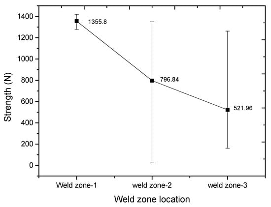 The strength of each weld was compared by measuring the individual weld strength. Figure 12 compares the strength of each weld using the average of the strength values measured in the 25 welding conditions. The strength of the weld zone was the highest in weld zone 1. Weld zone 1 was where the horn came into direct contact with the aluminum surface, and received an indentation fracture, an aluminum base-material fracture, and an interface fracture. In weld zone 3, the strength was the lowest, at an average of 521.96 N. The average strength of weld zone 1 was 1,355 N, and the strength distribution was more than 1200 N in most parts of weld zone 1 because the dispersion width was very small. However, in weld zone 2, the average strength was 796.84 N and the distribution of the maximum and minimum value was very wide. In addition, the distribution range of strength was also very wide in weld zone 3. The influence of a change in welding conditions on strength was very small in weld zone 1, whereas weld zones 2 and 3 were very sensitive to the welding conditions. Although the melt area was not measured directly, the melt area could be predicted because the magnitude of the tensile load was relatively proportional to the size of melt area, as shown in Figure 12.