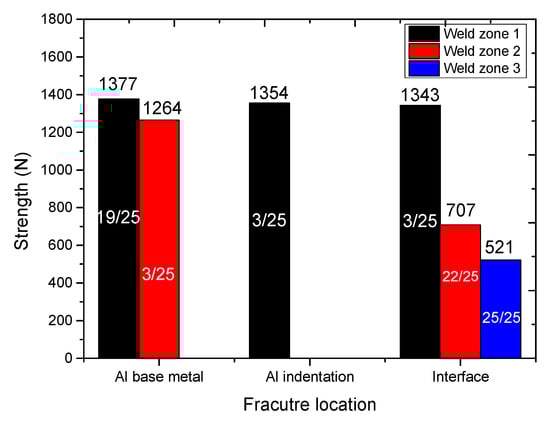 Fractures can be broadly classified into three general types, according to their location: aluminum base material fracture, aluminum indentation fracture, and interface fracture. Strength according to each fracture type is compared in Figure 13. The aluminum base material fracture shows the strength of the aluminum material (1200 N or more), and the indentation fracture shows similar fracture strength to aluminum. In the case of an interface fracture, weld zone 1 shows a similar fracture strength to aluminum, but weld zones 2 and 3 show less than 1/2 the strength of weld zone 1. In terms of the frequency of the weld fracture, weld zone 1 showed an aluminum base material fracture type in 19 out of 25 experiments, and showed indentation and interfacial fracture types three times, respectively. Weld zone 2 showed an interface fracture type about 88% of the time. However, weld zone 3 exhibited interface fracture type in all of the 25 experiments. The interface fracture of weld zone 3 was found to be the lowest, at 521 N.