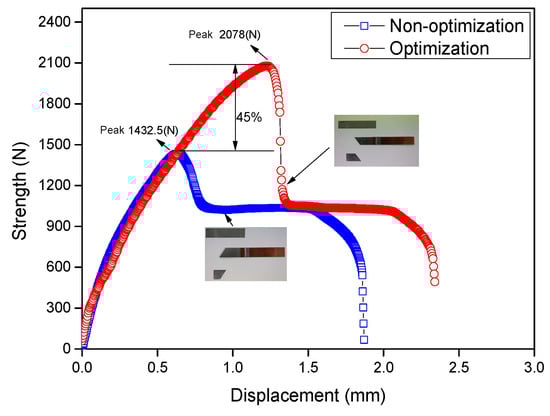 Additional experiments were carried out to evaluate the performance of weld zone under optimum conditions. The non-optimizing welding conditions for the comparison with the optimized welding conditions were selected by the highest welding strength among the 25 tests performed previously. Non optimizing welding conditions, such as 50% of amplitude, 3.5sec of welding time, and 1.0 of pressure load were used. The experimental method was divided into two parts; first, the maximum strength was compared when both the aluminum plate and the copper plate were simultaneously tensioned. In addition, three shear strength measurement tests were performed for each specimen to determine the strength of the welds individually. Figure 14 shows the displacement–strength curve when all of the welding specimens were tensioned using optimized welding conditions and non-optimized experiment conditions. Both welding conditions exhibited similar displacement–strength curves. The maximum tensile strength was confirmed to be 45% higher under optimized welding conditions compared to other cases. The maximum tensile strength refers to the load which the two sheets of aluminum can withstand. This is represented by the load applied to the entire material, when the four plates are overlapping. This refers to the force before the fracture of the first aluminum indentation. Afterwards, the second aluminum plate withstands all tensile loads, causing the aluminum base material to fracture. The fracture occurs due to the plastic deformation of the second aluminum, and the section where the load is maintained consistently during the constant displacement is the section where the second aluminum is deformed.