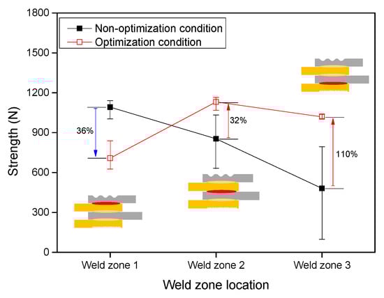Comparison of strength between non-optimized conditions and optimized conditions at each weld zone.