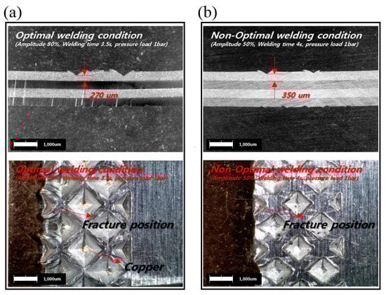 The shear strength measurement test results using a UTM are divided into three types through the displacement–load curve. As shown in Figure 6, three interfaces are created when ultrasonic welding with four sheets, and their characteristics are as follows. Three ultrasonic welds are used to weld the four thin plates.