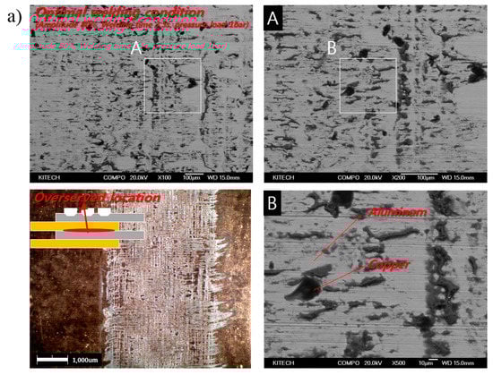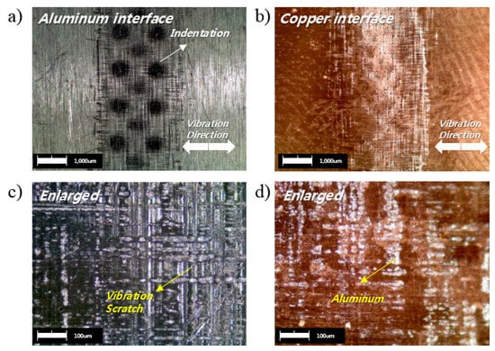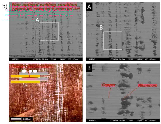 In the ultrasonic welding of aluminum and copper sheets, tearing occurs in aluminum because copper is harder. Looking at the two interfaces, there was an indentation pattern of a circle on the opposite side of the aluminum. Both interfaces showed vibration marks in the transverse direction, and the aluminum tissue was observed on the copper interface, as shown in Figure 17b. The distribution of aluminum on the copper interface was observed to determine the cause of the difference in weld strength between the case with and without the optimized conditions.