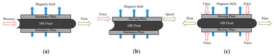Basic operational modes for MR fluid devices: (a) valve mode, (b) shear mode, and (c) squeeze mode.