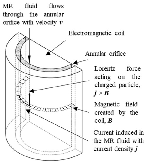 In MR fluid dampers, the macroscopic physics can be understood as occurring due to a Lorentz force. As illustrated in Figure 3, when the electromagnetic coil is in the on-state, a magnetic field B is generated in the horizontal direction. When the damper is actuated, the MR fluid experiences a changing magnetic field. According to Faraday’s law of induction, an electromotive force (EMF) is induced and a current will flow around the annular orifice with current density j. The interaction between the current density and magnetic field creates a force that opposes the motion of the fluid [45]. This force is called a Lorentz Force and is equal to the cross product of the current density and magnetic field . It is this interaction of the fluid and magnetic field that creates a damping force and will result in a higher pressure differential across the annular orifice.