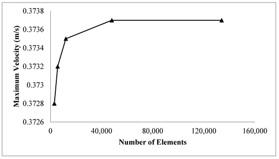 A mesh sensitivity analysis was performed in order to arrive at a mesh-independent solution. To this end, based on the unmagnetized case, a mesh convergence study was conducted by gradually decreasing the element size and observing the changes in the maximum velocity in the fluid flow, as shown in Figure 5. It can be seen that the maximum velocity reached its asymptotic value (to four significant figures) once the mesh reached a 0.25 mm element size. For this element size, there were a total number of 48,000 mesh elements, and the maximum velocity within the domain was 0.3737 m/s.