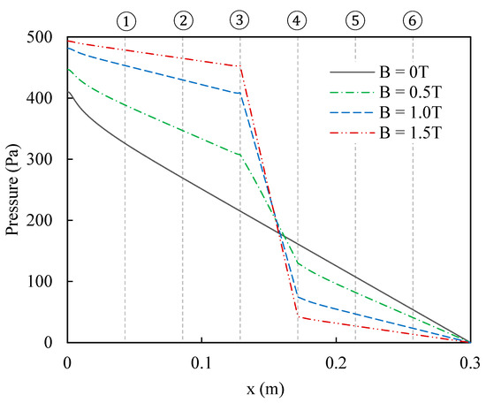 Figure 8 shows the static pressure measured across the annular orifice when a constant inlet pressure of 500 Pa and magnetic field strengths from 0 T to 1.5 T were applied. In the absence of a magnetic field, the resistance to shear flow experienced by the damper was due to the viscosity and the yield strength of the composite fluid. In this case, a linear pressure drop was observed between the inlet and the outlet of the computational domain, and the pressure drop across the annular orifice, between locations ③ and ④, was 53.82 Pa.