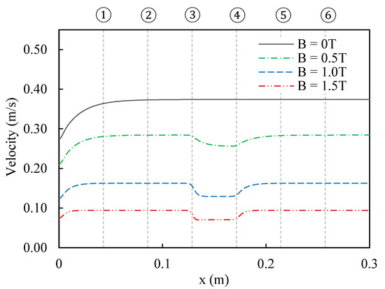 Velocity distribution along length of the channel with various magnitudes of externally applied magnetic fields.