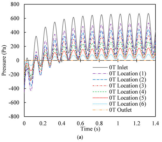 The inlet and outlet of the domain were defined by specifying the pressure at these locations. The outlet pressure was set to be the gauge pressure for all the simulations conducted in this study, while three different cases of inlet pressure were investigated, as shown in Figure 7. The first case was a constant pressure of = 500 Pa. The second case involved the application of an oscillating sinusoidal pressure with respect to time: