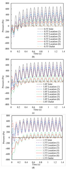 Change in static pressure at various measurement locations with respect to time under a sinusoidal inlet pressure profile and an externally applied magnetic field of: (a) B = 0 T, (b) B = 0.5 T, (c) B = 1 T, and (d) B = 1.5 T.