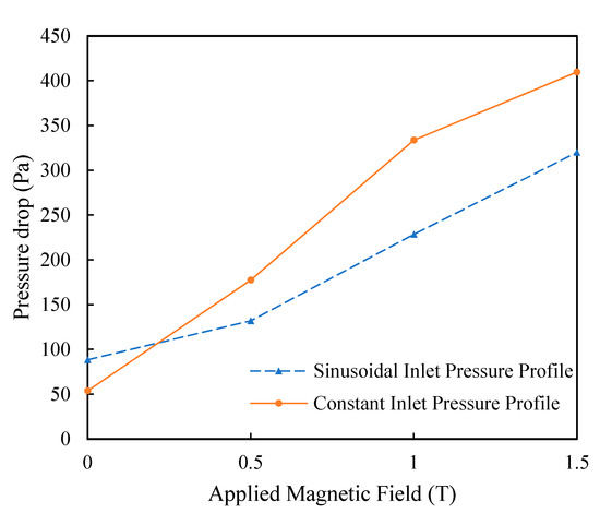 Pressure drop between locations ③ and ④ at various magnitudes of external magnetic fields for the sinusoidal inlet pressure profile and the constant inlet pressure cases.
