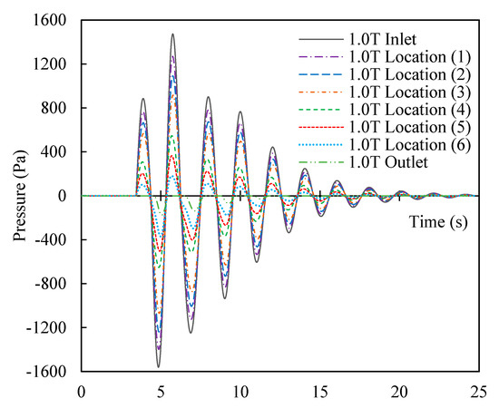 The third case is based on the Northridge earthquake in 1994 [46]. According to the displacement measured during the earthquake, the inlet pressure was scaled and approximated using a piecewise function, as shown in Equation (22).