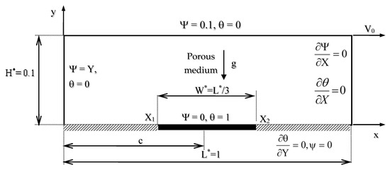 In this study, mixed convection heat transfer has been studied in a channel filled with a porous medium. The related geometry, boundary conditions, and coordinates are shown in Figure 1. This figure shows the coordinates and boundary conditions. The length of the bottom wall was L, and the height of the cavity was H = L/10. The rest of the bottom surface is adiabatic, while one third of the bottom of the channel was heated at a constant temperature. The top wall was kept at a constant cold temperature.