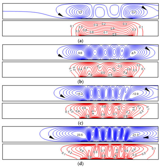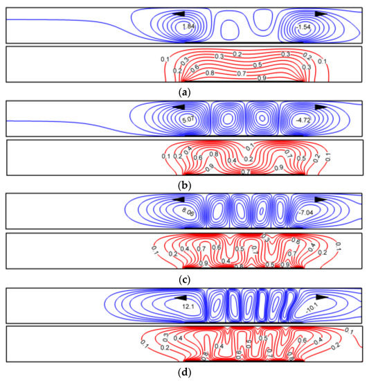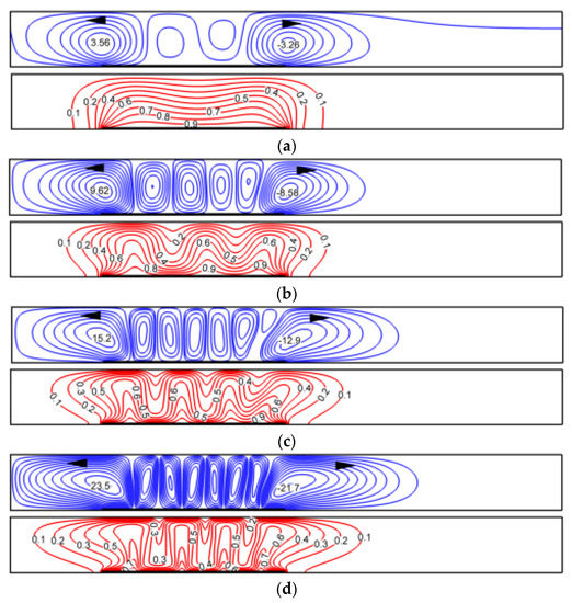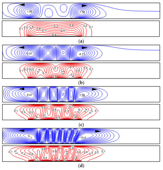 In Figure 2b, Ra = 250 increases the number of rotation centers, thus causing the temperature curves to fluctuate. The values of Ψmin = −8.58 and Ψmax = 9.62. With the increase of the Rayleigh number in Figure 2c, the heated fluid on the lower surface diffuses into the closed volume, and hence penetrates further. As is seen from the relevant temperature curves, the heat transfer through the transmission is reduced, while the heat transfer through the convection starts to dominate. This situation is more apparent in Figure 2d. The increase in the Rayleigh number intensifies the flow, increases the center of rotation within the volume, and causes the temperature curves to further penetrate the edges of the surface. For higher Rayleigh numbers, Figure 2c,d, the convection is vigorous with Ψmin = −12.9, Ψmax = 15.2 and Ψmin = −21.7, Ψmax = 23.5, respectively. However, the absolute values of minimum and maximum flow values increase.